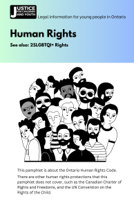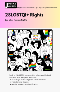 Resources Publications Human Rights & 2SLGBTQI+ Rights Protection, making a claim, GSAs & 2SLGBTQI+ groups in schools, trans-inclusion and gender segregated spaces, government ID Legal Rights Learn about your rights in various areas of law Helpful Organizations Other resources for young people Donate Help children and youth be safe and secure
